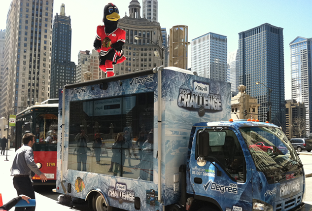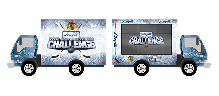 Degree Men's partnership with 4 NHL teams including the Chicago Blackhawks, Detroit Red Wings, Buffalo Sabres and Pittsburgh Penguins. Design of the logo lockup, posters, communication cards and interactive truck wrap.