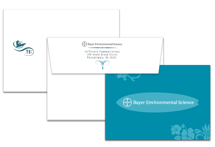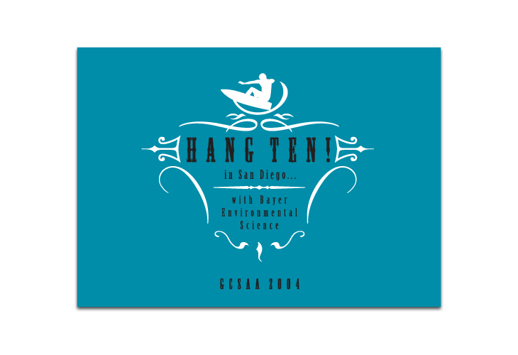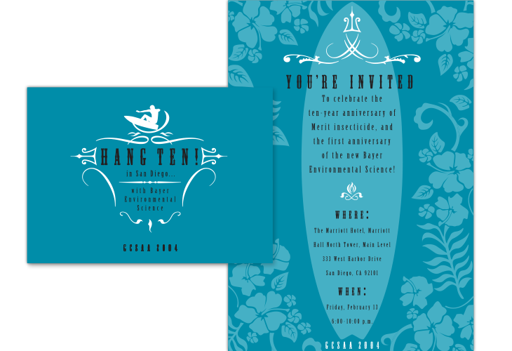 Two color invitation for the surfing themed conference for Bayer Environmental Science in San Diego.