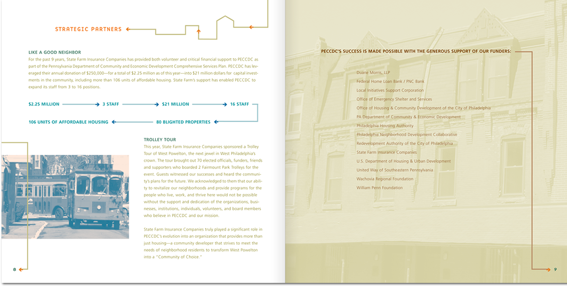 An annual report for the real estate arm of the People's Emergency Center, a Philadelphia based non-profit organization that focuses on the revitalization of West Philadelphia.